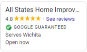 With nearly 30 years of experience and a 4.8-star rating and Google Guaranteed status, homeowners can trust the experts at All States Home Improvement for stress-free home improvements. We are fully insured and licensed, and we will be a reliable partner for your next home renovation. To learn more call us at (316) 444-1220, fill out our convenient estimate form, or stop by our local showroom to schedule a free, no-obligation consultation.
